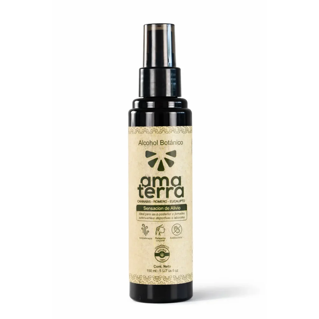 El Alcohol Botánico Amaterra es un producto de uso externo inspirado en prácticas tradicionales de maceración de plantas aromáticas y medicinales. Su fórmula combina cannabis, romero y eucalipto, brindando una experiencia refrescante y reconfortante, ideal para masajes y cuidado corporal después de actividades físicas exigentes.
